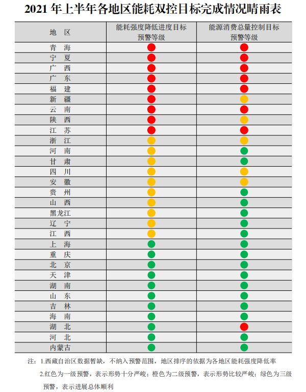 近日,國家發(fā)改委在例行新聞發(fā)布會上對9個省區(qū)直接點(diǎn)名:青海、寧夏、廣西、廣東、福建、新疆、云南、陜西、江蘇9地上半年能耗強(qiáng)度同比不降反升!此外,還有10個省份的能耗強(qiáng)度降低率未達(dá)到進(jìn)度要求,全國節(jié)能形勢十分嚴(yán)峻。根據(jù)發(fā)改委印發(fā)《2021年上半年各地區(qū)能耗雙控目標(biāo)完成情況晴雨表》可知,廣東、福建、云南、江蘇、浙江、安徽、四川等12個地區(qū)在能耗降低和能源消費(fèi)總量方面均呈現(xiàn)嚴(yán)峻態(tài)勢,這意味著有一半以上的省份上半年“雙控”目標(biāo)未能完成。